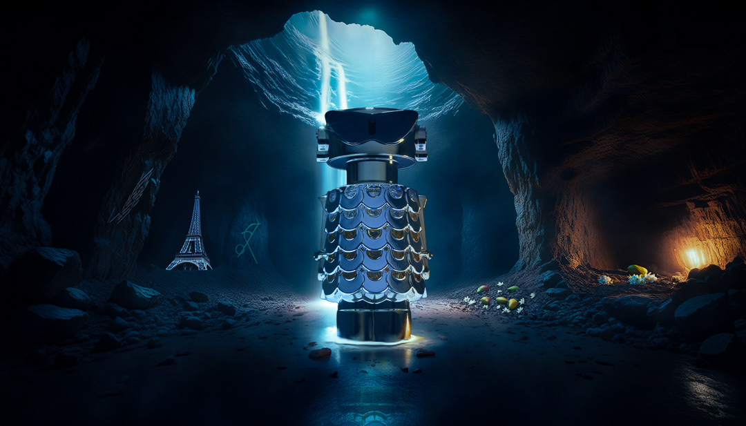 Esta imagem de trabalho pessoal explora a ficção científica com o frasco do perfume Fame, cuja estética inovadora e futurista sugere uma vibe quase alienígena. (perfume Fame Paco Rabanne)